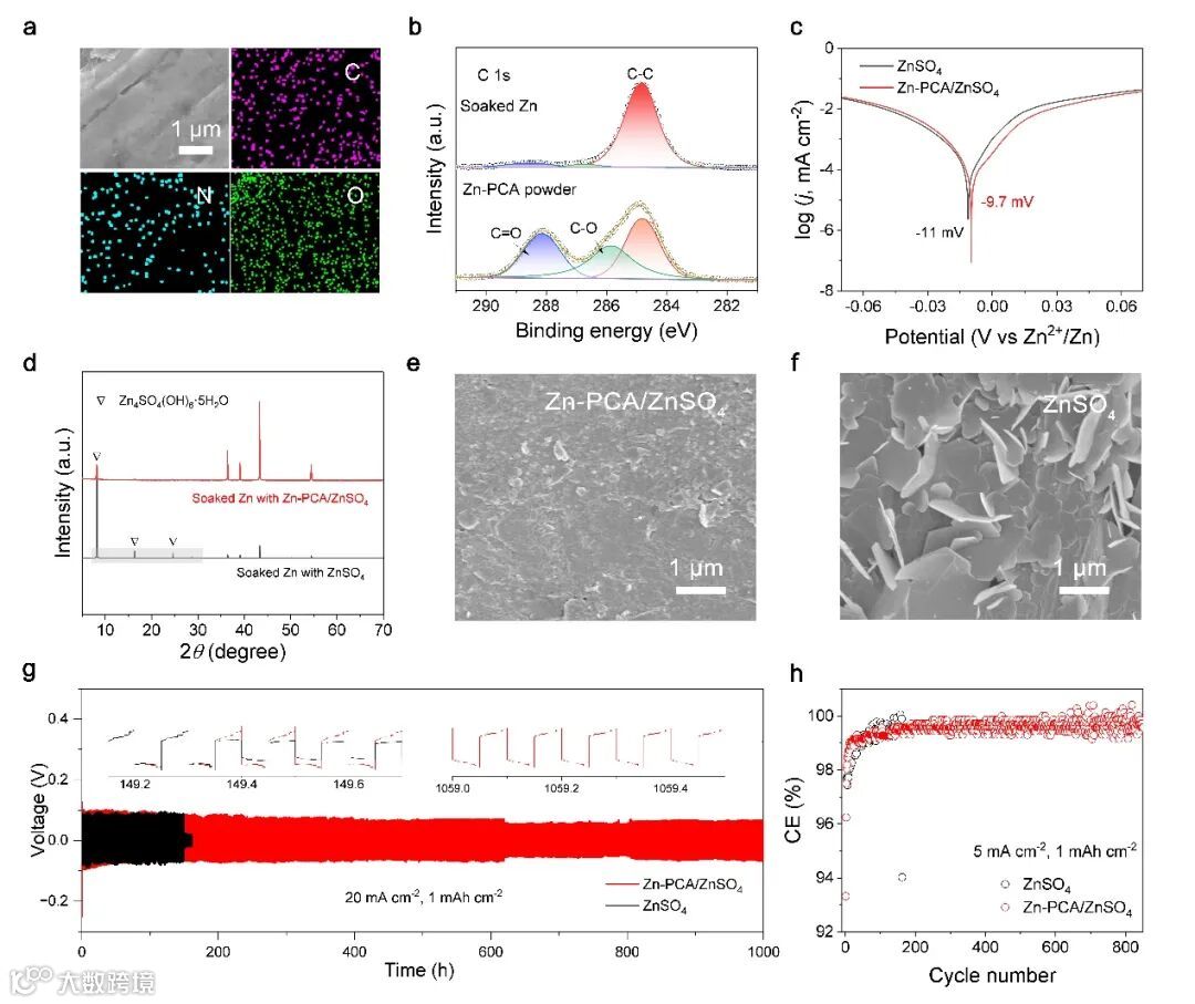 图3. PCA−阴离子在Zn负极上的吸附及其电化学性能。a)Zn负极在含Zn-PCA添加剂的ZnSO4溶液中浸泡一周后的EDS图。b)C1s XPS光谱。c)Zn箔在有/无Zn-PCA添加剂情况下的腐蚀速率的线性极化曲线。d)在含/不含Zn-PCA添加剂的2 M ZnSO4中浸泡的Zn负极的XRD图。Zn箔在e)Zn-PCA/ZnSO4电解液和f)ZnSO4电解液中浸泡一周后的SEM图像。g)Zn对称电池在20 mA cm−2(1 mAh cm−2)下的循环性能。h)Zn金属负极在Zn-PCA/ZnSO4和ZnSO4电解液中的CE。