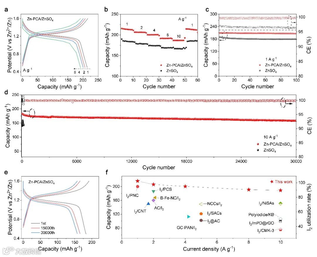 图4. Zn-I2电池在有/无Zn-PCA添加剂情况下的性能。a)具有Zn-PCA添加剂的Zn-I2电池在不同充放电电流密度下的电压曲线。b)有/无Zn-PCA添加剂的Zn-I2电池的倍率性能比较。c)1 A g−1和d)10 A g−1的循环测试中,Zn-I2电池的循环性能和CE曲线。e)具有Zn-PCA添加剂的Zn-I2电池在第1、15000和30000个循环时的电压曲线。f)基于电流密度、比容量和I2利用率的不同Zn-I2电池性能对比。