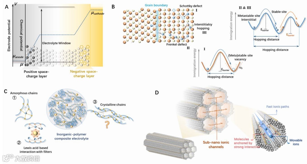 图1. 固态电池中电化学势演变、目前主流电解质的传导机理,及框架电解质结构示意图。