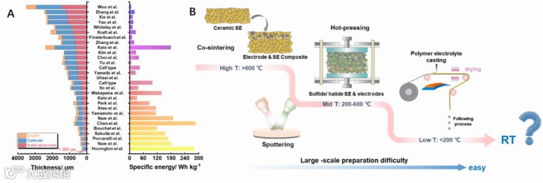 图3. 固态电池能力密度与电解质厚度的关联性总结,以及目前主流固态电池的制备方案。