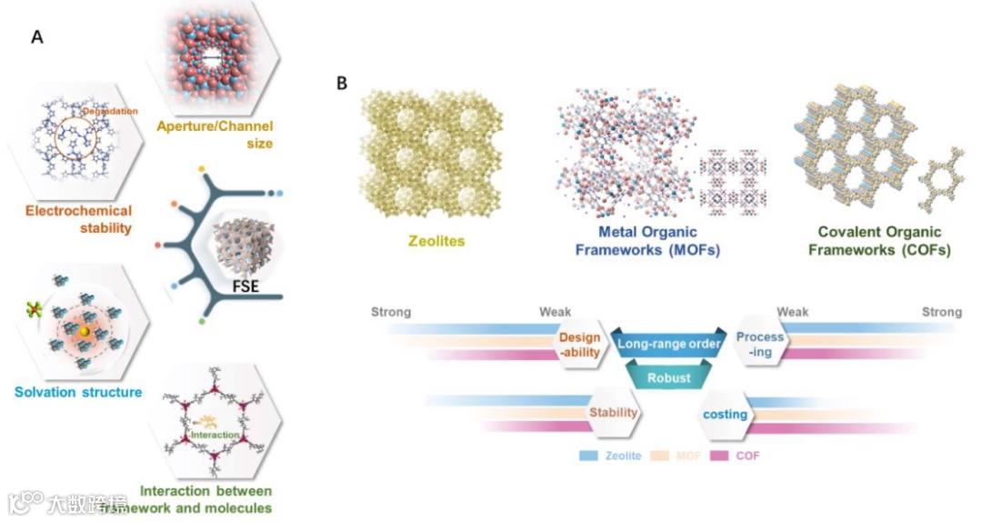 具体如图1所示,鉴于框架材料中在亚纳米尺度中存在的大量连续的有序孔网络,并且它们具有在亚纳米尺度上捕获客体分子的独特能力,因而其可以用来设计离子快速迁移的合适通道。在亚纳米级的孔道中,框架结构绑定的分子将与目标离子存在弱相互作用,离子在框架锚定的分子/阴离子的辅助下可以独立迁移,并且这种弱相互作用可以加速离子跳跃并实现较低的迁移能垒,从而实现高离子电导率。这种独特的固体电解质结构被定义为框架电解质(FE),其宏观表现出固态特性。