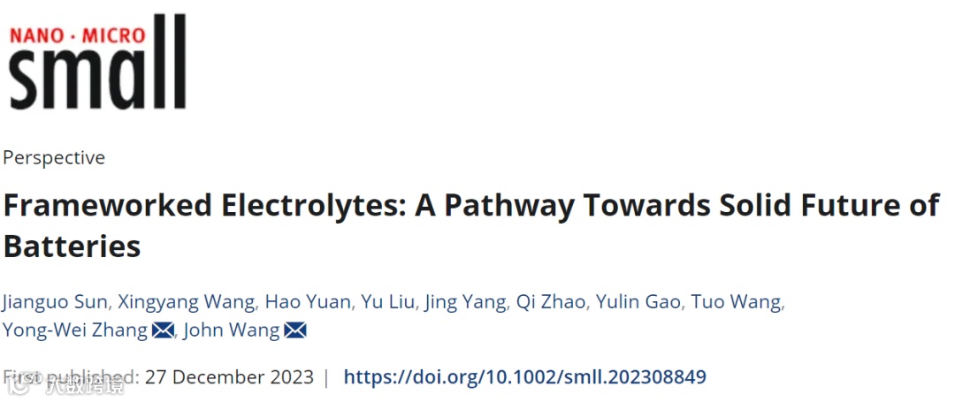 近日,来自新加坡国立大学/新国大重庆研究院John Wang院士课题组孙建国研究员联合A*STAR 超算中心Yong-Wei Zhang教授在国际知名期刊Small上发表题为“Frameworked Electrolytes: A Pathway Towards Solid Future of Batteries”的观点文章。该观点性文章提出了开发一种全新的基于凝聚态框架电解质的固态电池,为基于框架电解质开发全固态电池提供了全面的分析,并且总结了未来框架电解质大规模制备的策略方案。笔者指出框架电解质在克服传统固态电解质的局限性方面提供了令人兴奋的机会,有希望进一步推动固态电池储能技术的的发展。