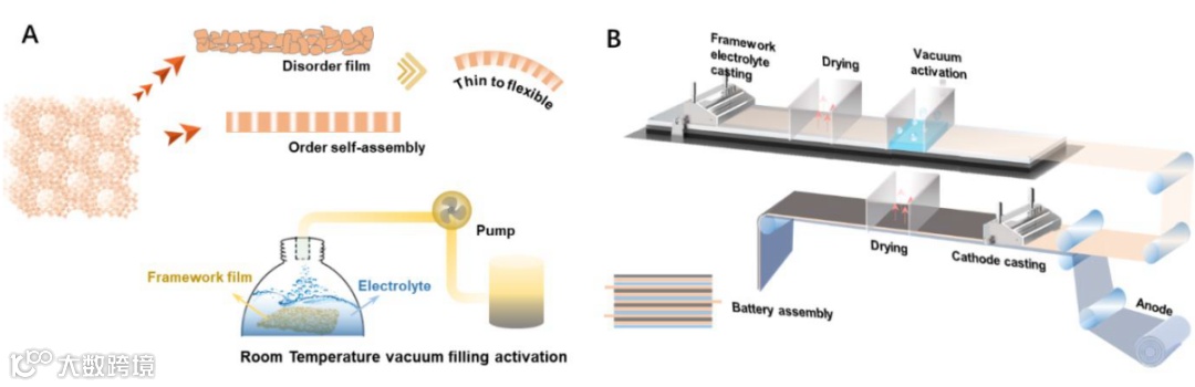 随后,研究人员总结了框架电解质中关键组成部分框架结构的选择关键要素,重点聚焦在框架结构的孔的尺寸,电化学稳定性以及与溶剂分子机离子的相互作用。在此基础之上,作者对比了目前可作为框架选择的沸石、金属有机框架,共价有机框架的综合特性,并且总结了目前关于离子、分子与框架材料的相互作用的研究,提出了未来框架电解质的发展方向及潜力。此外鉴于目前在追求高能量密度的固态电池设计方面对于超薄固态电解质的追求(如图3),作者提出了框架电解质在室温下制备固态电池的巨大优势,并且探讨了关于如何实现框架电解质商业化大规模制备的有效途径(如图4)。