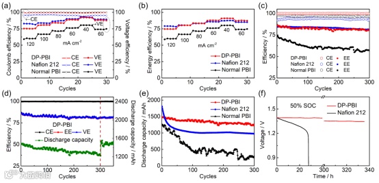 图4.DP-PBI组装的全钒液流电池运行数据。