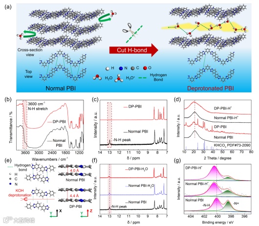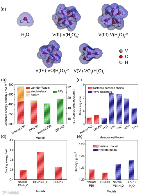 使用氢氧化钾/乙醇作为铸膜溶剂制备PBI可以得到改性的DP-PBI膜。溶剂中强碱性的氢氧化钾可以使PBI链的咪唑环去质子化。与常规策略制备的PBI相比,DP-PBI的广角X射线衍射图谱峰值发生偏移,表明两个PBI共轭平面之间的平均距离从约4.0 Å增加到4.4 Å。链间距的提升是由于去质子化过程切断链间氢键,从而削弱了链的有序排列。而在全钒液流电池强酸性环境中,通过核磁共振氢谱分析得知DP-PBI中引入了大量水分子后可形成水分子链,并与PBI链形成氢键,这些水分子链不仅维持住了膜的高链间距结构,同时还促进了膜在酸中的质子化。进一步分析了水分子链在DP-PBI膜中的构成基础,可知不仅是因为脱质子化的PBI链与水分子具有更高的亲和性,同时高链间距结构也促进水分子进入链间空间。