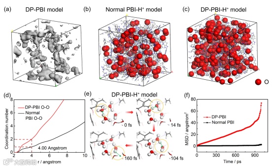 基于隔膜结构,我们分析膜中的主要质子传递方式为格罗特斯机制,即氢键的快速连续断裂及形成。该机制主要贡献者就是水分子链。我们基于理论建模分析DP-PBI的结构,并通过理论计算来模拟水分子链形成的结构基础及其与质子传导之间的构效关系。从模型中的空腔结构来看,DP-PBI模型不仅显示出可使水分子链形成的连续通道,而且显示出比常规PBI模型更丰富的空腔分布,表明DP-PBI模型比常规PBI模型更适合水分子进入并形成水分子链。从分子动力学角度分析,DP-PBI模型中作为格罗特斯机制的主要跳跃位点的氧分布明显比常规PBI模型中的氧分布更密集,表明DP-PBI模型中的质子以格罗特斯机制传递比常规PBI模型更容易。同时,我们在DP-PBI模型中观察到质子通过断裂和形成氢键在水分子之间快速跳跃,表明DP-PBI中的水分子链可以通过格罗特斯机制有效地转移质子。同时模拟得到的DP-PBI模型的理论质子电导率显著高于常规PBI模型,与实验结果一致(30.33 vs. 1.93 mS cm-1)。