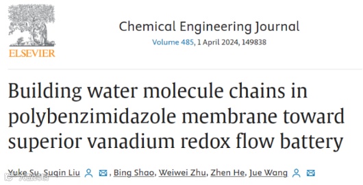 Yuke Su, Suqin Liu, Bing Shao, Weiwei Zhu, Zhen He, Jue Wang, Building water molecule chains in polybenzimidazole membrane toward superior vanadium redox flow battery, Chemical Engineering Journal, 2024.