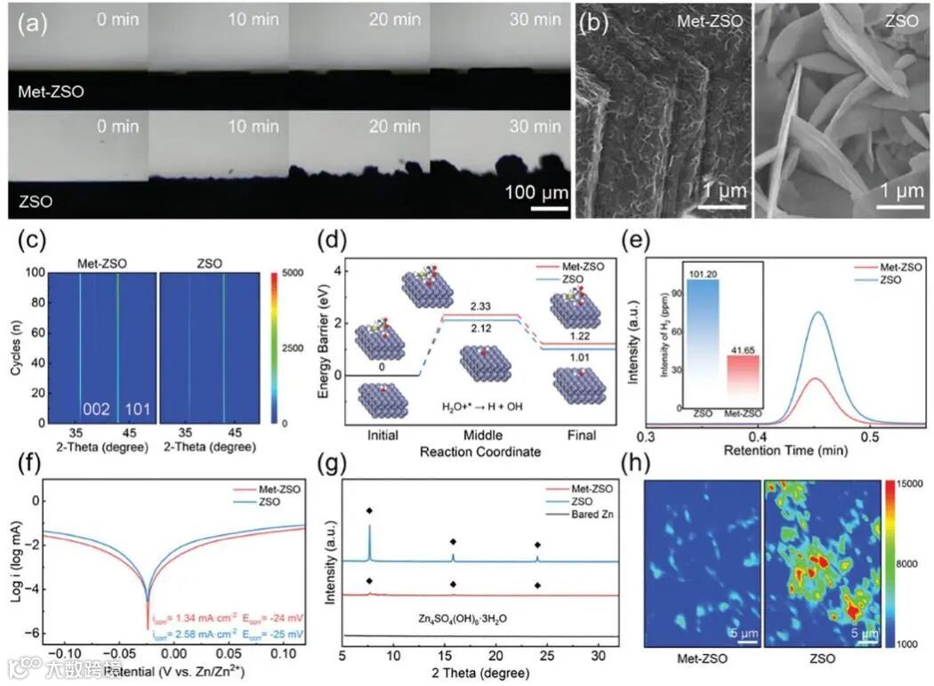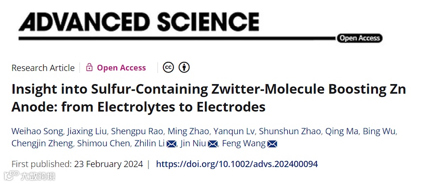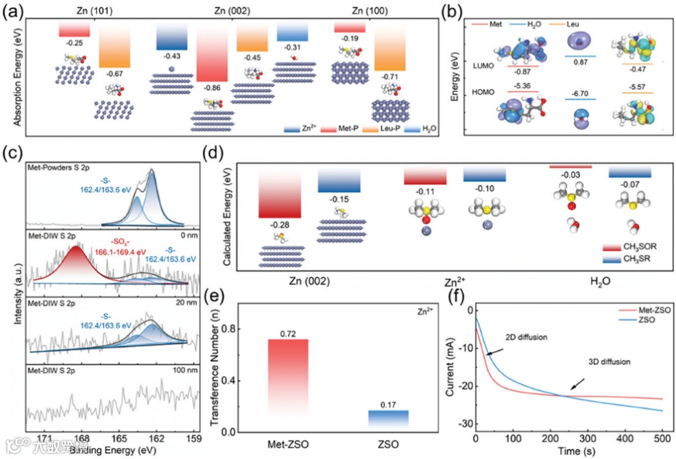 近日,北京化工大学王峰教授/牛津副教授团队在国际知名期刊Advanced Science上发表题为“Insight into Sulfur‐Containing Zwitter‐Molecule Boosting Zn Anode: from Electrolytes to Electrodes”的研究文章。该工作采用一种含硫的两性分子(甲硫氨酸,Met)作为添加剂,有效改善了硫酸锌电解液,显著提升了金属锌负极的性能,详细研究并揭示了Met从电解液到电极所发挥的不同作用。