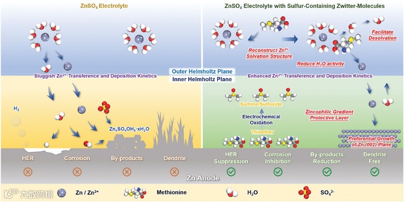 图1. 含硫两性分子作为硫酸锌电解液添加剂的改性机理示意图