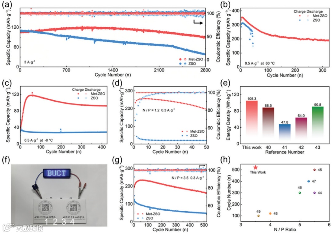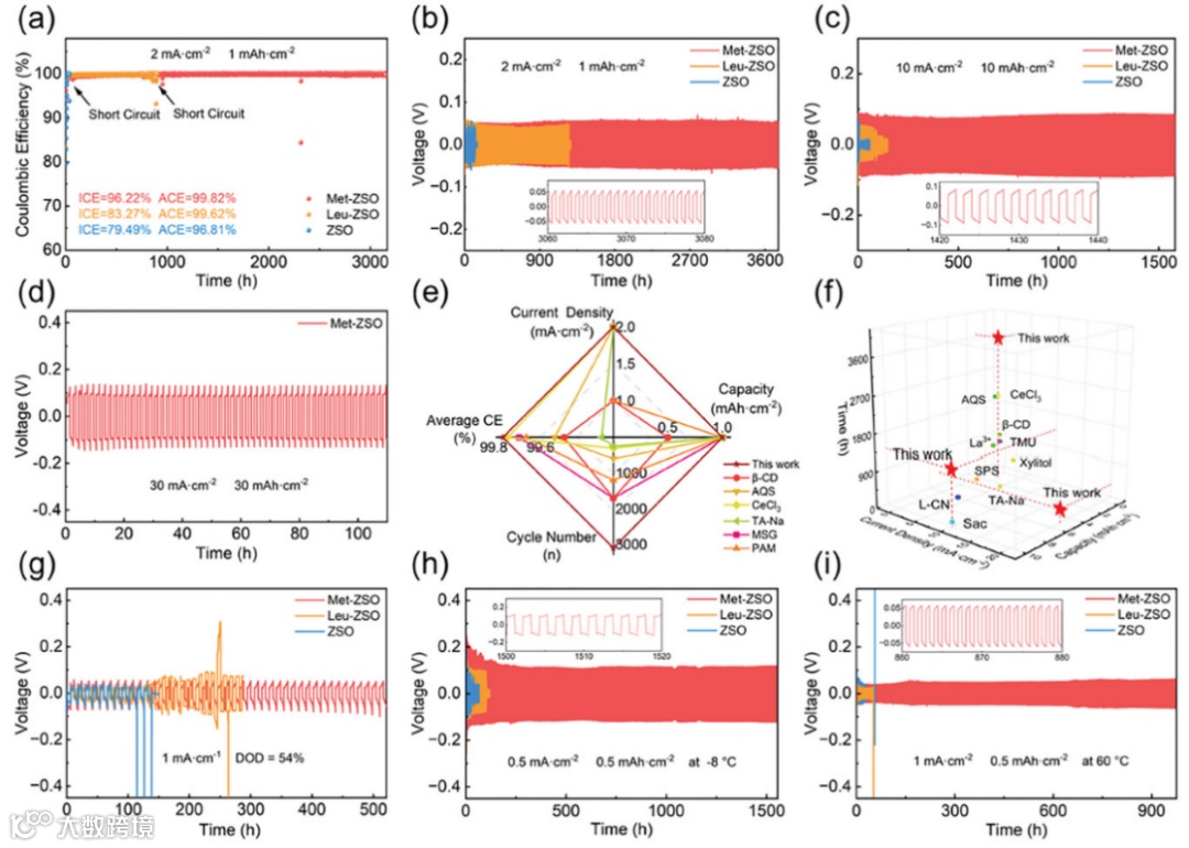 总之,该工作将Met用作水系锌金属电池的电解液添加剂,详细研究并揭示了Met从电解液到电极所发挥的不同作用。即使在极端测试条件下,含Met的电解液也能赋予半电池和全电池良好的性能,这项工作不仅为含硫两性分子在锌负极表面的改性机理提供了新的见解,也为开发实用型水系锌金属电池的开发提供了新策略。