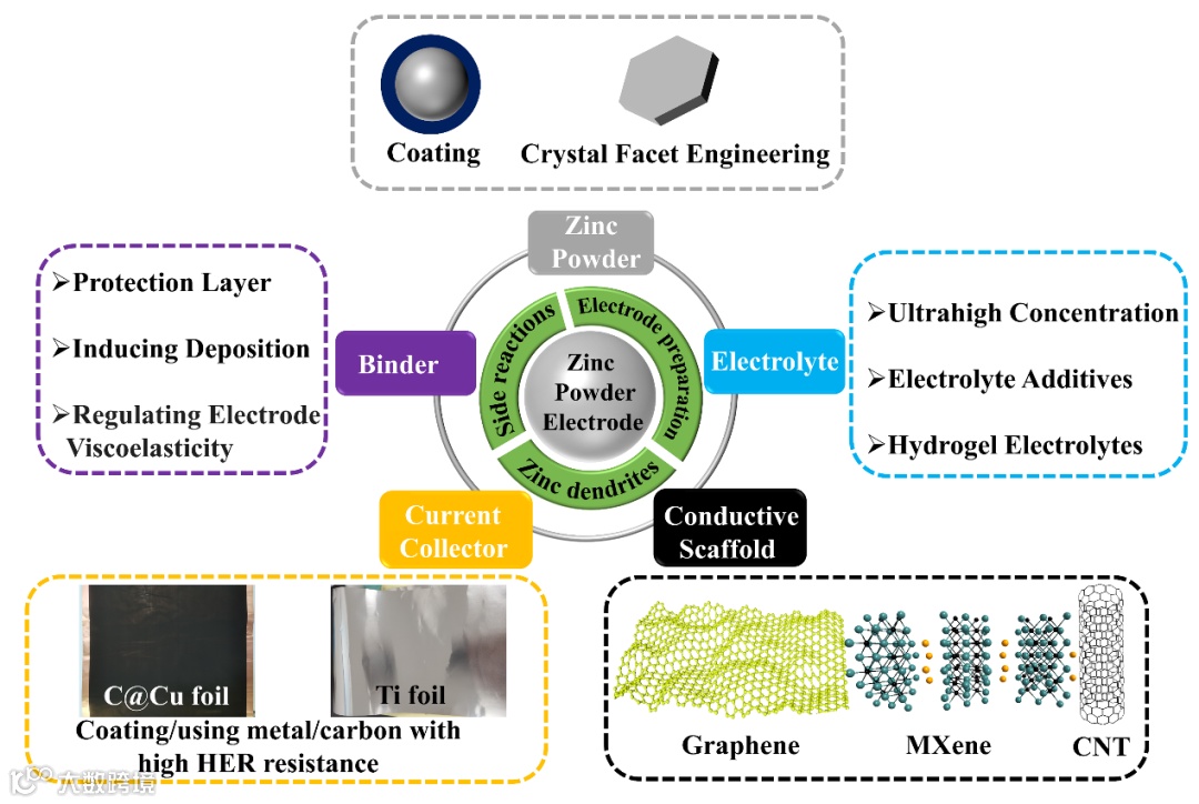 现阶段研究所使用的锌粉通常为商业化的微米级球形颗粒,具有较高的反应活性,易发生析氢和腐蚀等副反应。通过对锌粉进行碳包覆,铋/铟金属包覆都能显著提高锌粉的稳定性。此外,通过晶面工程合成六边形棱柱锌粉,其暴露的(002)晶面不仅抗腐蚀,还可以诱导锌离子(002)晶向沉积。集流体与锌粉存在的电化学势差异会导致电偶腐蚀。利用析氢过电位高的Sn包覆Cu箔,或直接使用Sn箔和Ti箔作为集流体,都可以有效减少电偶腐蚀。锌粉电极在充放电过程中存在体积膨胀与收缩,导致电极结构坍塌和电子传导受阻,因此导电骨架对于维持电极结构与电子通路非常重要,如活性炭,Graphene,MXene,CNTs,碳纳米纤维等,它们还可以起到诱导锌离子均匀沉积和抑制副反应的作用。粘结剂也是维持锌粉电极结构稳定的重要成分之一,开发新型粘结剂,可以提高电极离子电导率,调节电极流变性质,抑制析氢和腐蚀副反应,调控锌离子沉积等作用。与锌箔类似,电解液优化对于锌粉负极的性能提升也至关重要,包括超高浓度电解液,电解液添加剂,水凝胶电解液等。