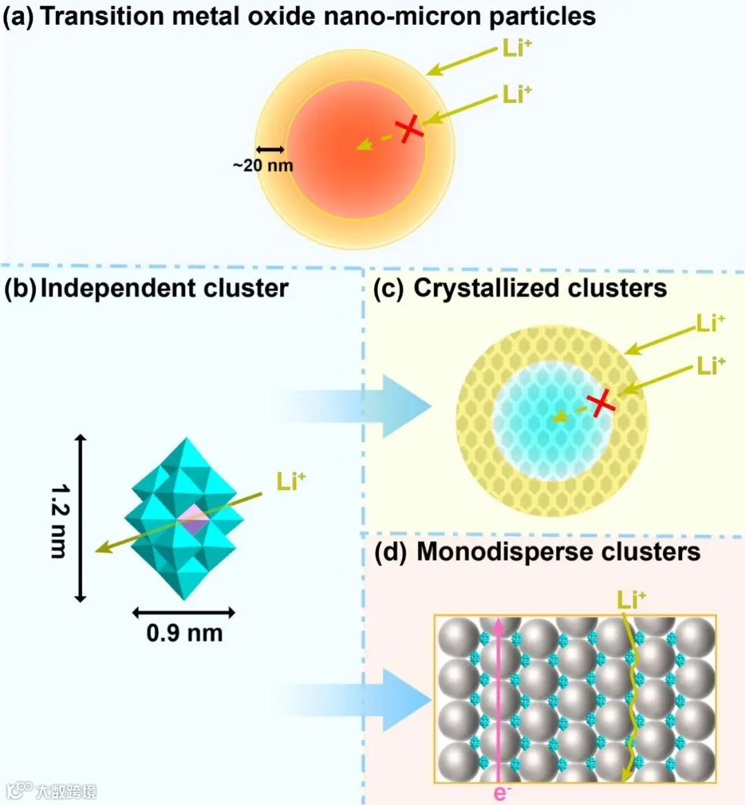 图 1. 锂离子在 (a) 过渡金属氧化物纳米颗粒、(b) 独立团簇、(c) 结晶团簇和 (d) 单分散团簇中的传输示意图。