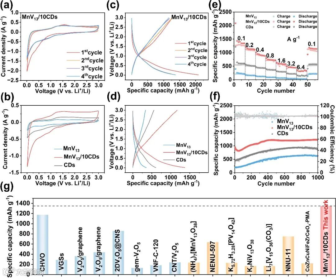 测试结果显示,当质量比为MnV13:CDs=1:10时,即MnV13/10CDs,该电极表现出最高的放电容量,达到1348毫安时每克(mAh g−1),并在随后的循环中显示出优异的循环稳定性和库仑效率。