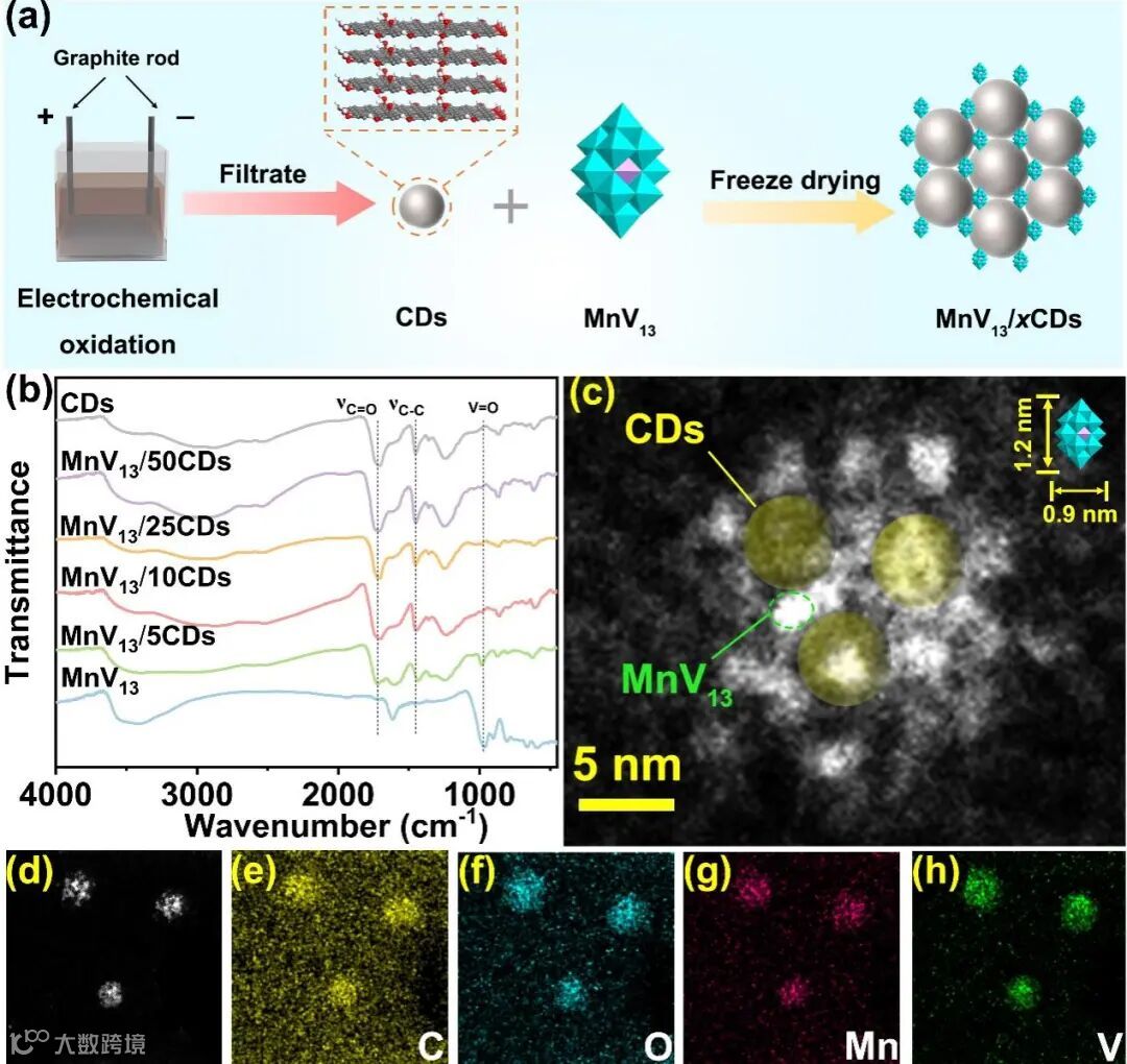 通过将碳点溶液与MnV13溶液混合并进行冷冻干燥,成功合成了单分散的MnV13团簇在碳点中的复合材料。通过FT-IR和XRD表征证实了MnV13团簇在碳点中的分散性,并通过HAADF-STEM和元素映射进一步证实了其结构和组成的均匀性。这些结果表明,碳点作为稳定剂有效抑制了MnV13团簇的不期望聚集,实现了其在碳点中的良好单分散。