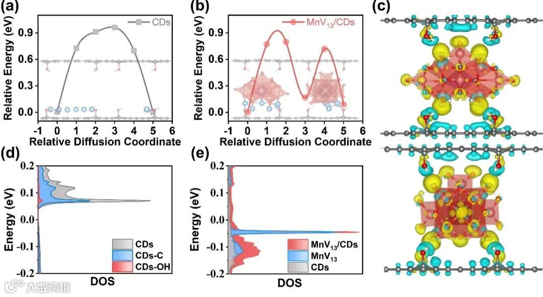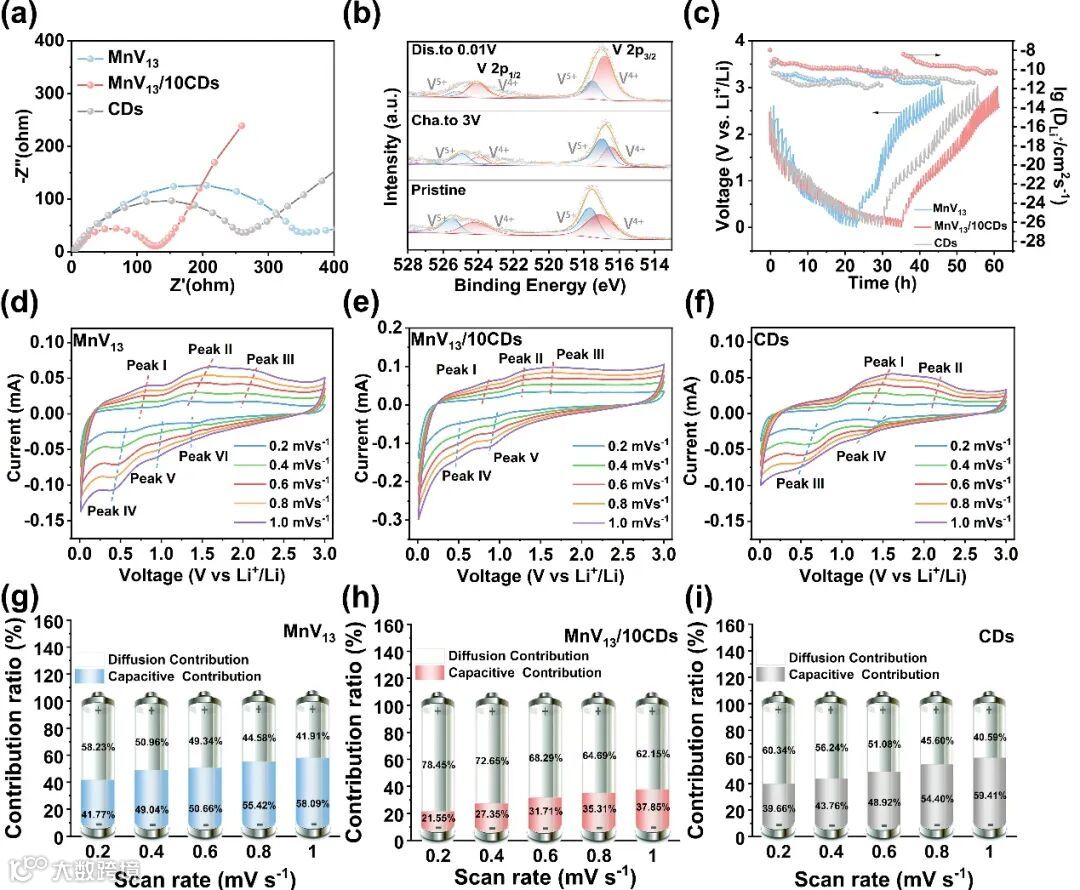 通过电化学阻抗谱(EIS)研究揭示了电极内锂离子的扩散动力学以及电极/电解液界面上的电荷转移情况。GITT技术用于评估充放电过程中锂离子的扩散系数,表明MnV13/xCDs电极具有出色的氧化还原活性和界面结构。CV曲线分析进一步揭示了在不同扫描速率下的电容贡献和扩散控制过程,证实了引入CDs可以同时提高电容储能和氧化还原反应的效率。