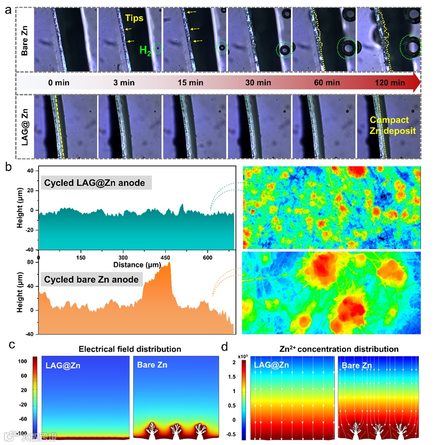 为了直观地证明LAG层对锌枝晶生长的抑制作用,采用原位光学显微镜技术观察了LAG层对Zn电镀/剥离的调控作用。与裸锌相比,在电镀过程中,LAG@Zn负极呈现出平坦无枝晶的沉积形貌,有力地证明了LAG界面层具有诱导均匀Zn沉积和抑制枝晶生长的作用。COMSOL模拟结果进一步证实,LAG层可以均匀电极/电解质界面处的电场和Zn2+浓度分布,进而实现了高度可逆的沉积/剥离。