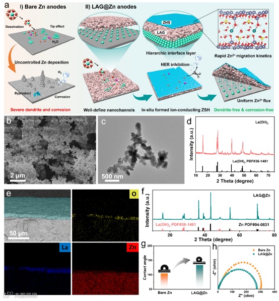 图1. LAG@Zn负极的调控机制示意图与其结构/组成及微观形貌表征。