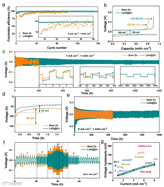 图5. LAG@Zn负极的电镀/剥离循环稳定性研究。