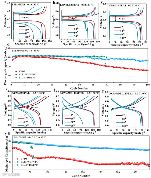 图5. Li/LFP电池的(a-c)充放电曲线和(d)循环曲线;Li/NCM622电池的(e-g)充放电曲线和(h)循环曲线