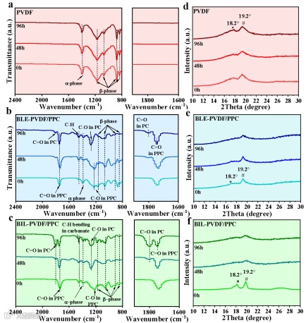 图3. 与锂接触不同时间的PVDF膜,PVDF/PPC混合膜和双层膜的FT-IR及XRD图谱