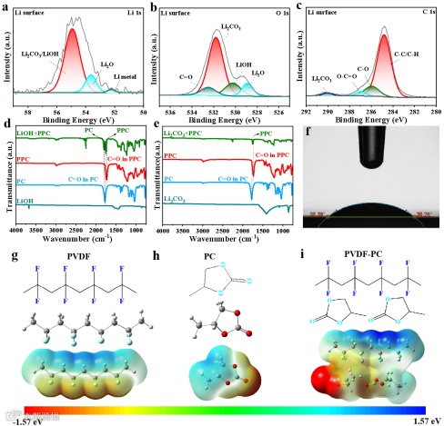 图2. (a-c)锂金属表面XPS图谱;PPC浆料与(d) LiOH和(e)Li2CO3粉末混合12h后FT-IR图谱;(f)PVDF膜与PC的接触角照片;(g)PVDF,(h)PC,(i)PVDF-PC的分子结构和静电势