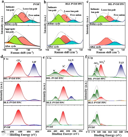 图7. PVDF基电解质在循环前后的(a-c)Raman图谱;基于PVDF基电解质的Li/NCM622电池在循环后的负极界面XPS图谱