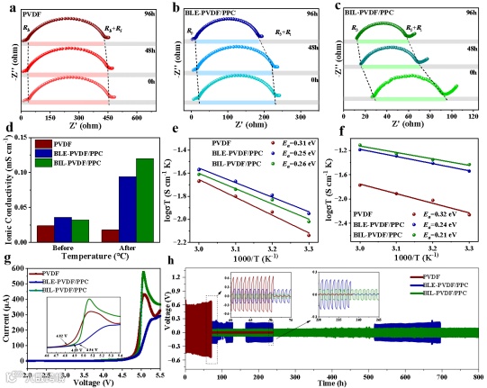 图4. (a-c) PVDF,PVDF/PPC混合和双层电解质对称锂电池的阻抗变化;PVDF基电解质与金属锂接触前后的(d)离子电导率;(e-f)活化能曲线;PVDF基电解质的(g)电化学窗口和(h)锂对称电池循环曲线