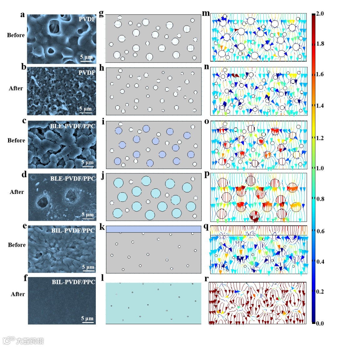 图6. (a-f) PVDF基电解质在循环前后的SEM图像;(g-r)PVDF基电解质内局部电流密度分布的COMSOL模拟结果