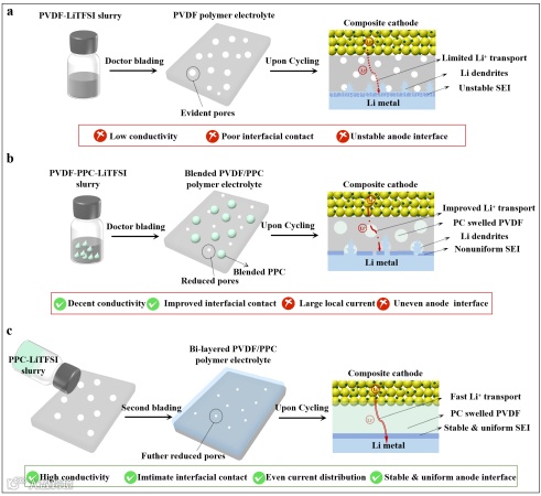 简而言之,本文利用PPC碱性降解为PC的特性,构筑了能够缓慢释放PC成分的PVDF基聚合物固态电解质,设计并比较不同构型的聚合物电解质的电化学性质及其在电池中的表现,发现了层状PVDF/PPC聚合物电解质中释放的PC可以被PVDF层均匀吸收,促进PVDF中的离子传输及稳定SEI膜的形成,最终实现了长循环的固态锂电池。本工作为高性能PVDF基聚合物电解质的开发及实用化固态锂电池的发展贡献了力量。该项研究得到国家自然科学基金、山东省自然科学基金等项目资助。