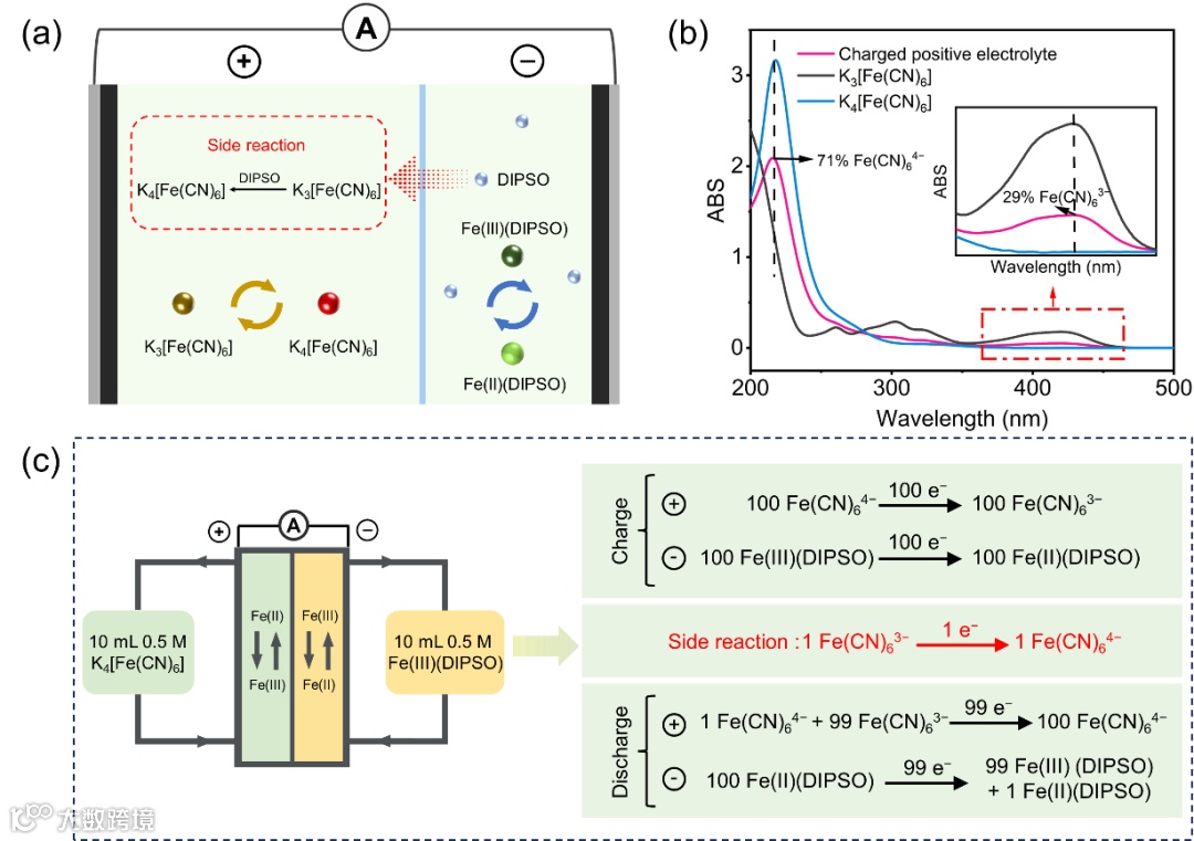 一般来说,液流电池的容量衰减原因有三种:(1)活性物质的不可逆分解;(2)活性物质的交叉污染;(3)正负极电解质中的副反应。研究人员以Fe(CN)6/Fe(DIPSO)全铁液流电池为例,通过一系列容量非对称电池实验以及光谱研究系统地分析了可能导致碱性全铁离子液流电池容量衰减的机制。研究表明正负极活性物质均没有发生不可逆分解,也没有检测到大体积铁络合物活性物质的交叉污染。进一步研究发现负极电解液中的游离配体能够穿过离子交换膜到达正极侧,并且与正极充电态物质(Fe(CN)63−)发生迅速的化学反应将其还原为Fe(CN)64−,这是导致正负极电荷失衡以及容量持续衰减的真正原因。