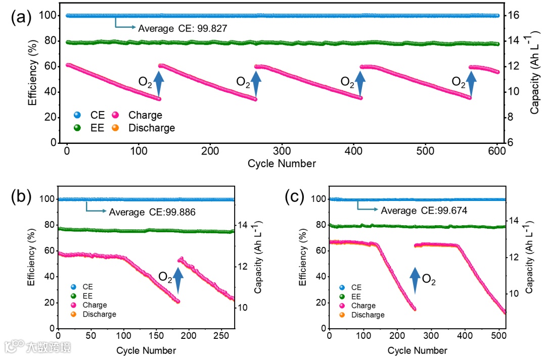 由于配体与Fe(CN)63−之间的副反应只会导致电池两侧的电荷不平衡(负极Fe(II)(DIPSO)积累)而不是活性物质的不可逆分解,因此电池的容量可以通过简单的电荷再平衡方法来完全恢复。当容量保持率降低至80%时,通过在负极电解质中引入O2以氧化累积的Fe(II)(DIPSO),电池容量可以多次完全恢复至初始值。这表明碱性全铁离子氧化还原液流电池在长时储能领域具有巨大的应用潜力。