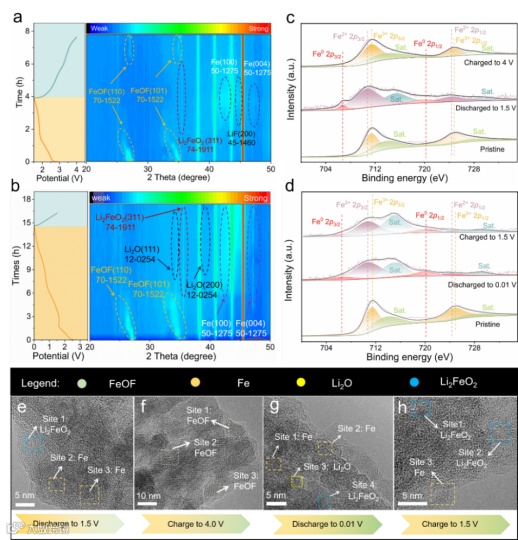 为了揭示FeOF的电荷存储机理,对其进行了原位X射线衍射、非原位X射线光电子能谱和非原位透射电子显微镜表征。多种原位/非原位表征表明,FeOF通过插层和转化反应的混合储锂机制实现了良好的储锂性能。