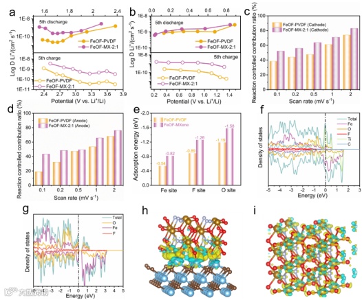 GITT测试结果显示,FeOF-MX分别作为正负极时均展现了更低的锂离子扩散阻力,证明引入MXene纳米片会显著加速锂离子的扩散。另外,动力学分析显示,FeOF-MX分别作为正负极时均实现了较大反应控制占比,表明FeOF-MX复合材料为表面诱导的赝电容式锂存储提供了更多的活性位点。进一步通过密度泛函理论(DFT)计算发现,FeOF微球与MXene纳米片之间的强界面相互作用可以促进离子迁移和Li吸附。