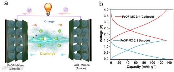 图1. 基于FeOF-MX构成的对称锂离子电池工作机理示意图以及正负极容量对比。