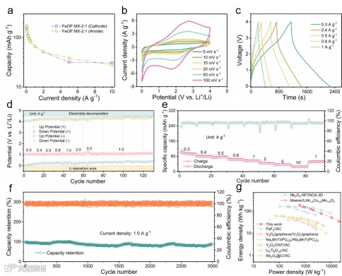 基于精心设计的结构和合适的电压范围,FeOF-MX作为正负极实现了显著的容量和倍率性能匹配(质量为1:1)。鉴于此,该工作进一步组装了FeOF-MX//FeOF-MX对称锂离子电池,其在功率密度为600 W kg-1 时能提供185.5 Wh kg-1的能量密度。即使在20000的高功率密度下,该锂离子对称电池仍能提供34.2 Wh kg-1的高能量密度。在1 A g-1下可以循环3000次,容量保持率为88.9%,证明了该电极材料的实际应用价值。此外,我们用以金属Li为参比电极的三电极Swagelok电池来测试正极和负极的工作电压范围。在稳定区域内,没有出现明显的锂沉积和电解液分解迹象,突出了这种对称电池优异的循环稳定性。值得注意的是,FeOF-MX正负极之间匹配的容量和动力学有效地解决了对称锂离子电池中正负极之间动力学不匹配的常见问题。
