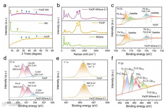 为了进一步说明复合材料的结构,使用拉曼光谱进行表征。观察到位于213、282、395、496和666 cm-1处的峰对应于FeOF中的Fe-F键的振动,1350(D带)和1590 cm-1(G带)处的两个谱带可归因于PVP碳化。另外,在FeOF-MX复合材料中,150-800 cm-1范围内的拉曼峰表明MXene成功地结合到FeOF结构中。X射线光电子能谱(XPS)表明MXene引入后Fe 2p, O 1s和F 1s核心能级的结合能升高,从而增加了电化学活性。