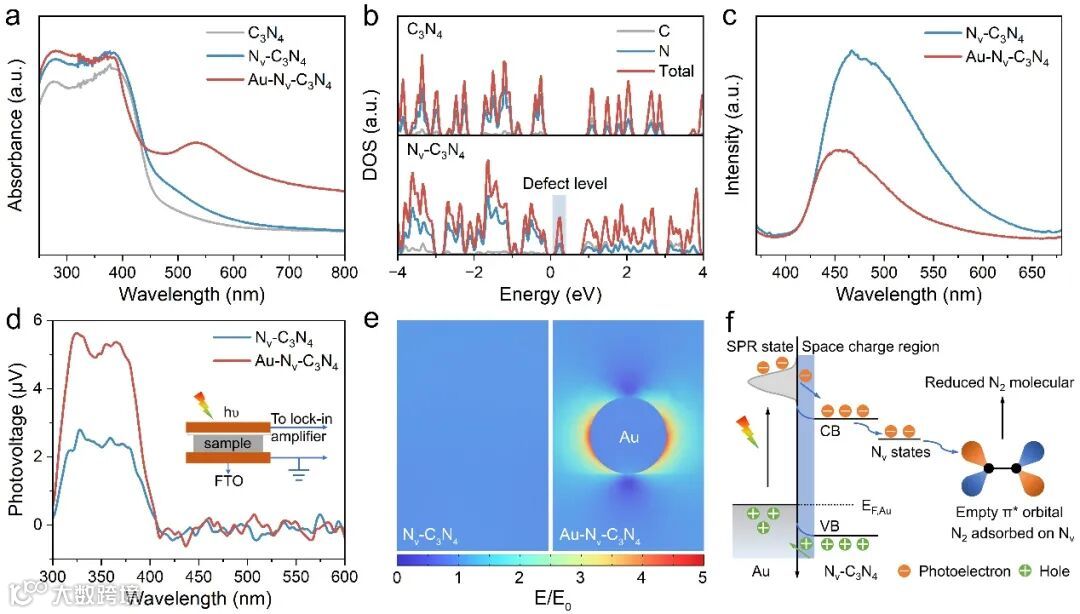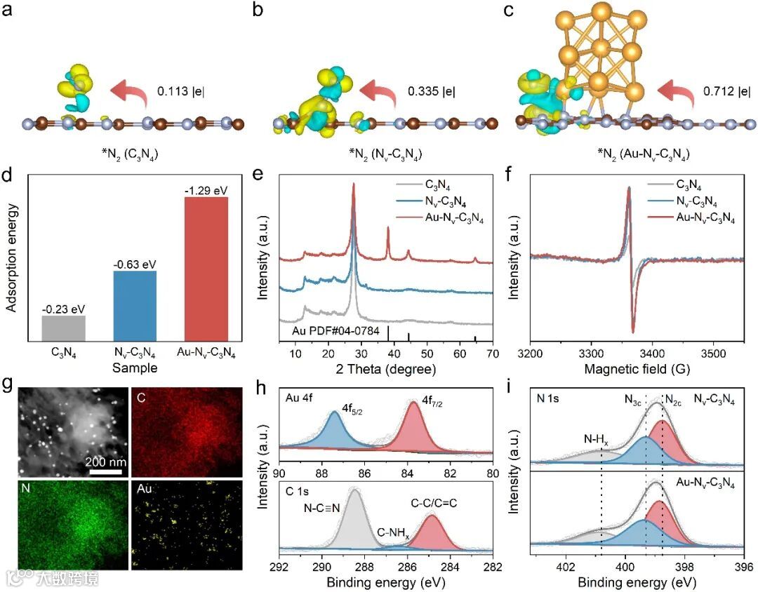 通常,光催化过程包括三个基本步骤:光吸收、光生载流子的分离和迁移以及光催化剂表面的氧化还原反应。为了进一步研究Au NPs和氮空位在这三个步骤中的作用,进行了一系列光催化性质表征。首先,Au NPs的负载显著提高了光催化剂对可见光的利用,同时光生载流子的分离效率也大大提高。其次,氮空位可以吸附并活化N2,并作为桥梁将光生电子注入到N2分子中。由于N2的π*分子轨道填充了光生电子,惰性的N≡N键被激活,从而提高了光催化N2还原的效率(图2)。