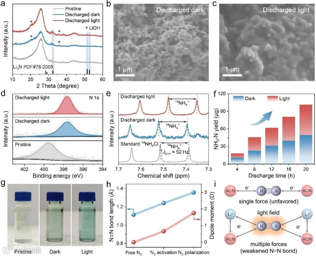 为了研究光辅助Li-N2电池反应机制,首先对放电产物进行表征。通过XRD、SEM、XPS和1H NMR证明了放电产物为Li3N。不同的是光照下生成的Li3N为薄膜状,这归因于光照下产生了大量的光生电子,可为N2还原提供更多的活性反应位点。这种薄膜状放电产物与阴极接触更紧密,有利于其在充电过程中分解。此外,光辅助Li−N2电池可以作为一种新的N2固定方法,Li3N生成的法拉第效率从黑暗中的28.5%迅速提高到光照下的58.4%,证明了光辅助Li−N2电池在N2固定方面的优势。通常,N2最初可以与催化剂相互作用,在引入Li+和光场之后,在N2、Li+、光和催化剂之间形成了多个力,增强了N2的活化。总之,在Li-N2电池放电阶段完成了N2的吸附和N≡N键的离解,生成了Li3N(图4)。