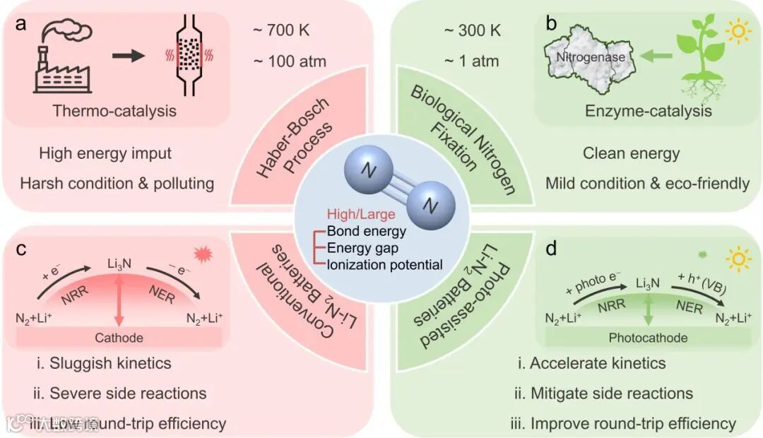 此外,在环境条件下利用丰富的太阳能进行光催化N2还原被认为是一种很有前景的技术。如果在Li−N2电池中实现光催化氮气还原和和析出反应,即N2分子在正极活性位点上被有效化学吸附,N≡N键可以很容易地被光生电子削弱和激活,则可以大幅提升Li−N2电池的反应动力学。