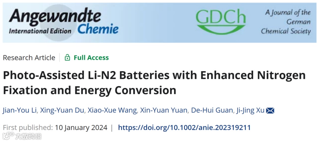 Jian-You Li, Xing-Yuan Du, Xiao-Xue Wang, Xin-Yuan Yuan, De-Hui Guan, and Ji-Jing Xu*, Photo-Assisted Li-N2Batteries with Enhanced Nitrogen Fixation and Energy Conversion, Angew. Chem. Int. Ed., 2024, DOI: 10.1002/anie.202319211.