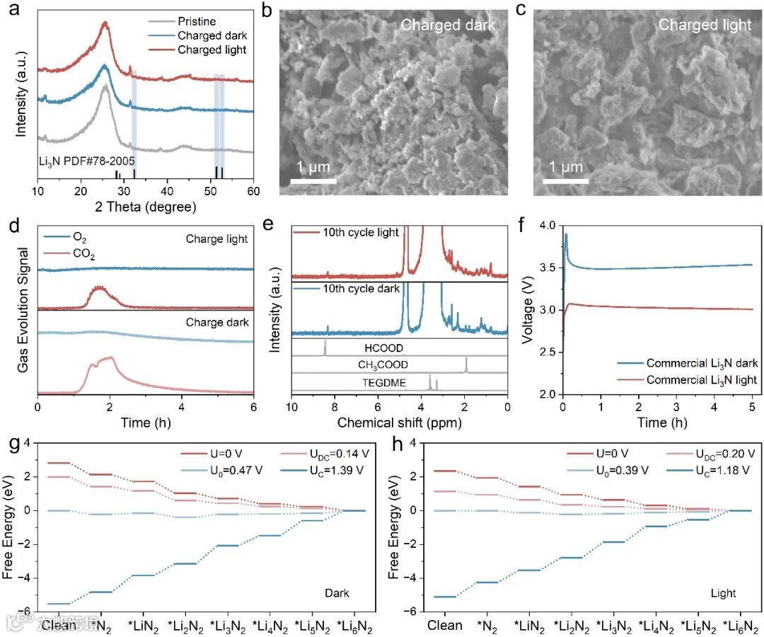 进一步解析充电后的Au-Nv-C3N4阴极以阐明光辅助Li−N2电池的可逆性。放电产物的消失表明Li−N2电池具有良好的可逆性。值得注意的是,作为一种复杂的系统,Li−N2电池会发生严重的副反应。气相和液相副产物检测表明在光照下副产物生成量更少,这表明光辅助策略可以提高N2还原反应选择性从而缓解副反应。此外,通过DFT计算获得了Li与N2反应过程的Gibbs自由能曲线,该进一步表明,光可以加速电池反应动力学,从而降低Li−N2电池中Li3N的成核和分解过程的过电位(图5)。