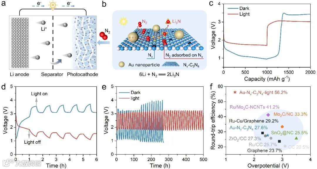 为了验证光辅助策略在Li-N2电池中的效果,采用具有最佳光催化活性的Au-Nv-C3N4作为正极催化剂,组装电池并测试性能。实验结果表明光照下的Li-N2电池具有更小的过电位、更加优异的循环和倍率性能。与报道的常规Li−N2电池相比,光辅助Li−N2电池显示出最低的过电位和最高的能量利用效率(图3)。