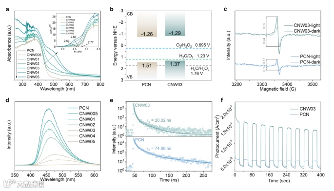 UV-DRS和能带分析表征证明W物种修饰引发了新的电子跃迁带,表明W位点为潜在的空穴富集区。结合原位EPR、PL、TRPL和光电化学测试,证实了原子级分散的W物种能够抑制抑制光生载流子的复合,促进光生电子和空穴的分离/转移。