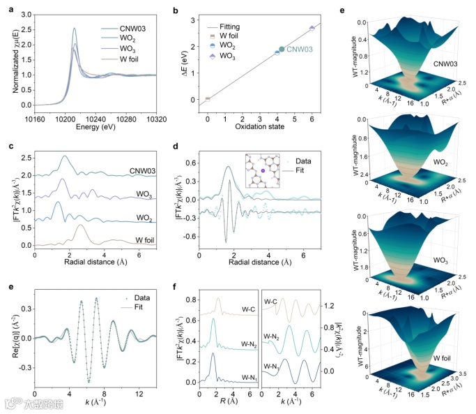 通过同步辐射X射线吸收光谱(XAS)研究了所制备CNW催化剂中W物种的电子结构和配位情况。结果表明W物种是以单原子级分散并于4个N原子配位,化合价为+4.2价。