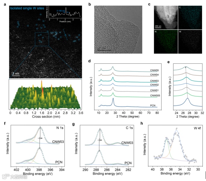 采用预配位和热缩聚法,成功将原子级分散的W物种锚定在g-C3N4三嗪环单元的相邻位点。HAADF-STEM, HRTEM证实了W物种的单原子级分散。