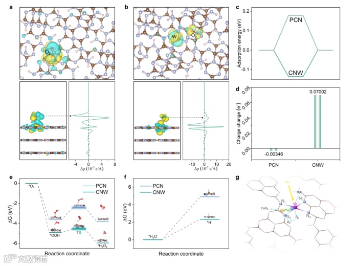 DFT理论计算表明,W物种的引入改变了O2在其相邻三嗪单元上的吸附模式,促进了光生电子向O2分子的转移并降低了中间产物*OOH的生成能及其向H2O2转变的过渡态能垒。更重要的是,光生电子-空穴对在孤立的W位点处分离时,光生空穴在W物种上积累并参与水的氧化,这个过程对于降低整体反应势垒和提高光催化 H2O2的生成速率至关重要。W位点上H2O分子的解离过程计算证实W位点的存在有效地减少了与水氧化过程相关的能垒,这有望加速H2O的解离并促进质子的提供,从而促进O2直接还原为H2O2。