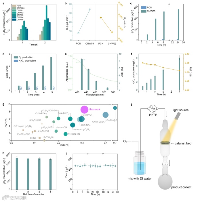 CNW光催化剂表现处优异的光催化H2O2合成活性,表现出可见光下1889.3 μg L-1 h-1的H2O2生成速率,420 nm波长下8.53%的量子效率,以及模拟太阳光照下0.31%的太阳能到化学能转化率。通过对比,所制备CNW光催化剂性能优于大多数已报道催化剂,且具有良好的稳定性,在长达60小时的流动反应池中连续稳定运行。