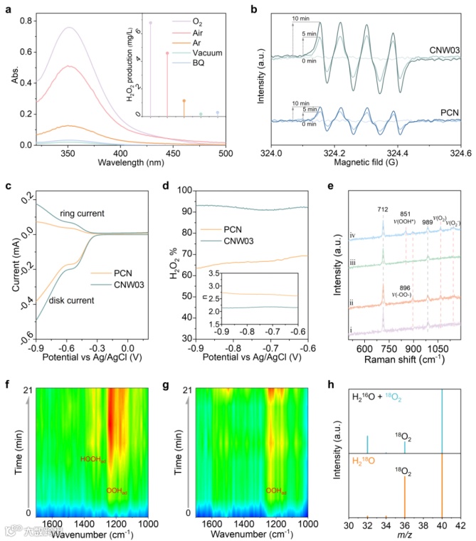 通过条件控制实验和EPR捕获实验证实了H2O2合成的氧还原路径为两步两电子反应(O2 + e- + H+ → *OOH; *OOH + e- + H+ → H2O2)。旋转环盘电极测试表明CNW具有高选择性的两电子ORR路径。工况下的拉曼和DRIFTS测试观察到了反应过程中O2吸附和中间产物的形成,结合同位素标记实验,推理出了H2O2合成是两电子ORR和四电子WOR的协同过程。