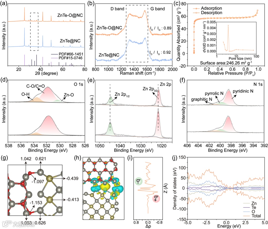 图1. (a) ZnTe@NC和ZnTe-O@NC的XRD谱图和(b)拉曼光谱。(c) ZnTe-O@NC的N2吸附/解吸等温线及相应的孔径分布。ZnTe@NC(下)和ZnTe-O@NC(上)的高分辨率(d) O 1s, (e) Zn 2p和(f) N 1s XPS光谱。(g) ZnTe−ZnO异质界面上的电荷转移情况。(h,i)异质结的平面平均电子密度差。(j) ZnTe−ZnO异质结态密度图。