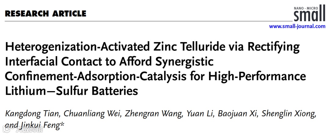 近日,来自山东大学的冯金奎教授在国际知名期刊Small上发表题为“Heterogenization-Activated Zinc Telluride via Rectifying Interfacial Contact to Afford Synergistic Confinement-Adsorption-Catalysis for High-Performance Lithium−Sulfur Batteries”的研究论文。该研究利用金属-有机框架衍生了N掺杂分层多孔碳包裹的ZnTe−ZnO异质结复合材料,在ZnTe−ZnO异质结界面处通过整流界面接触形成了内置电场,加速界面处的电荷转移,增强了ZnTe对多硫化物的吸附和转化动力学性能。